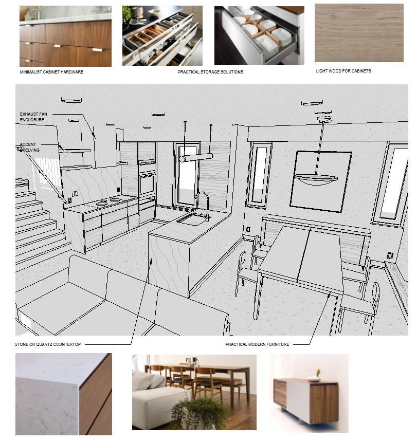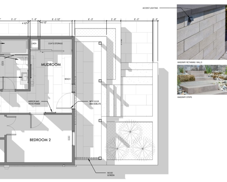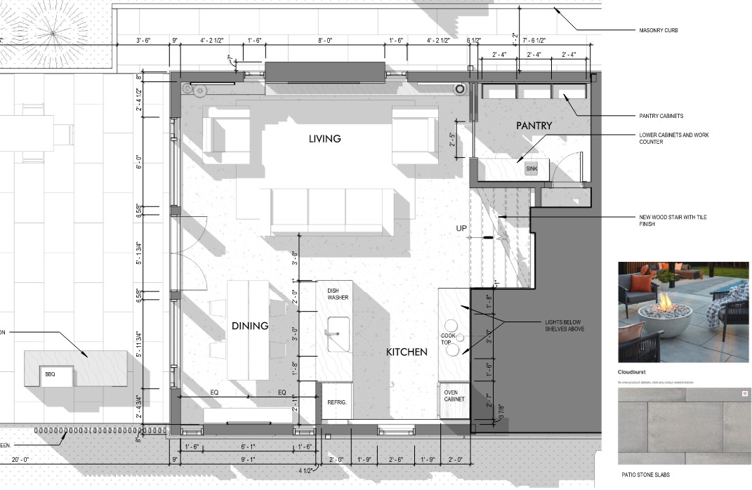 In the summer of 2025, I was contacted by the owners of a house I helped renovate 20 years ago. They were interested in giving their house a refreshed, more modern look. We started the design process based on the owners' program, which included the renovation of the living room, dining room, entrance, kitchen, and 2 bathrooms. They also wanted to introduce a more interesting material palette for the exterior facades and landscaping elements. Below is a clip from the design drawings, showing the main living area extending into a wide outdoor patio.