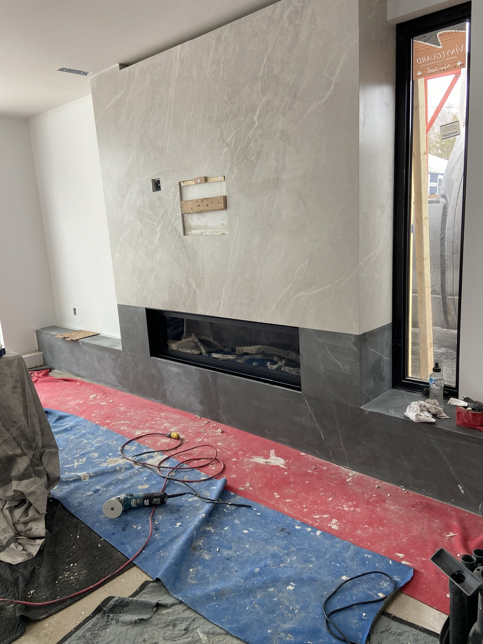 The building permit was applied for and obtained in the fall of the same year, and construction started soon thereafter. The images below show the progress on site and demonstrate how for a modern look, the details are often minimal, but they do require careful planning to achieve. The fireplace was re-designed with large format porcelain panels and the polished concrete floor will complete the look. The framing around the windows was kept to a minimum detail, for a nice modern touch.